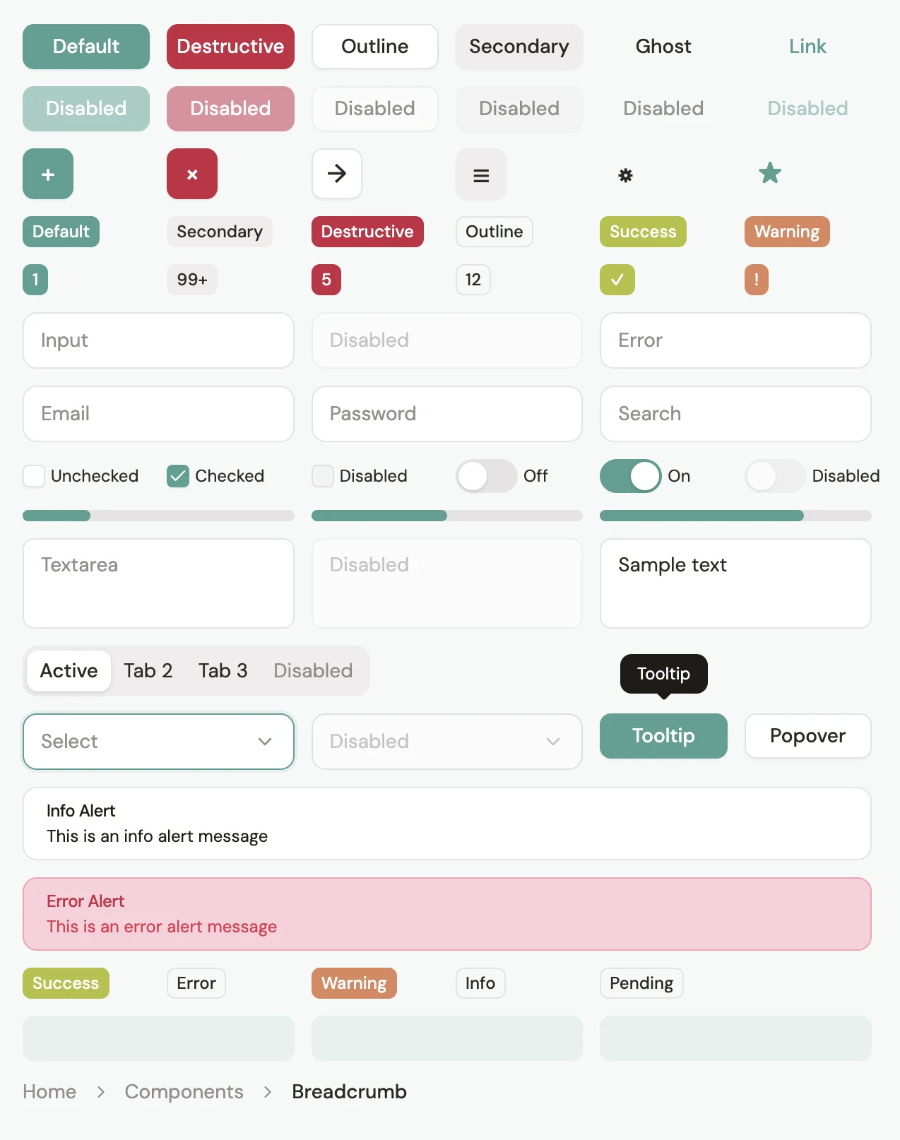 Mesh includes the full range of interface building blocks: buttons, inputs, cards, badges, selects, checkboxes, tooltips, popovers, and dialogs. Most inherit directly from shadcn/ui