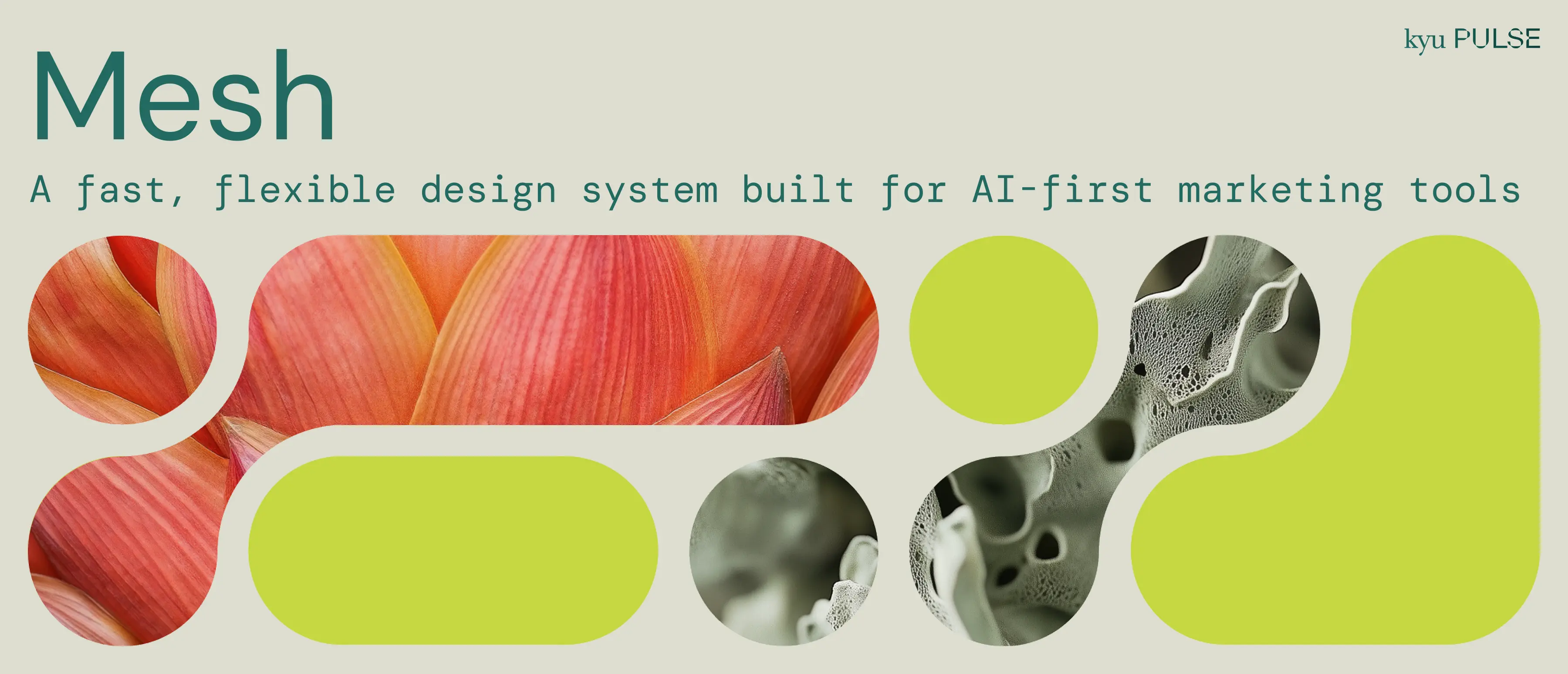 Mesh is a design system built for kyu Pulse, a unified network of creative and tech firms including Sid Lee, Kepler, BIMM, and Digital Kitchen. The network blends purpose-driven creativity with data and AI-enabled tech designed to deliver breakthrough client impact.